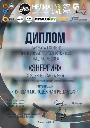 Из 650 претендентов были выбраны победители и призеры в нескольких номинациях. Редакция студенческой газеты НГТУ «Энергия» заняла 3 место в номинации «Лучшая молодежная редакция». Студент 2 курса ФГО, специальность филология, Илья Бигачев занял 2 место в номинации «Лучший дизайн издания».