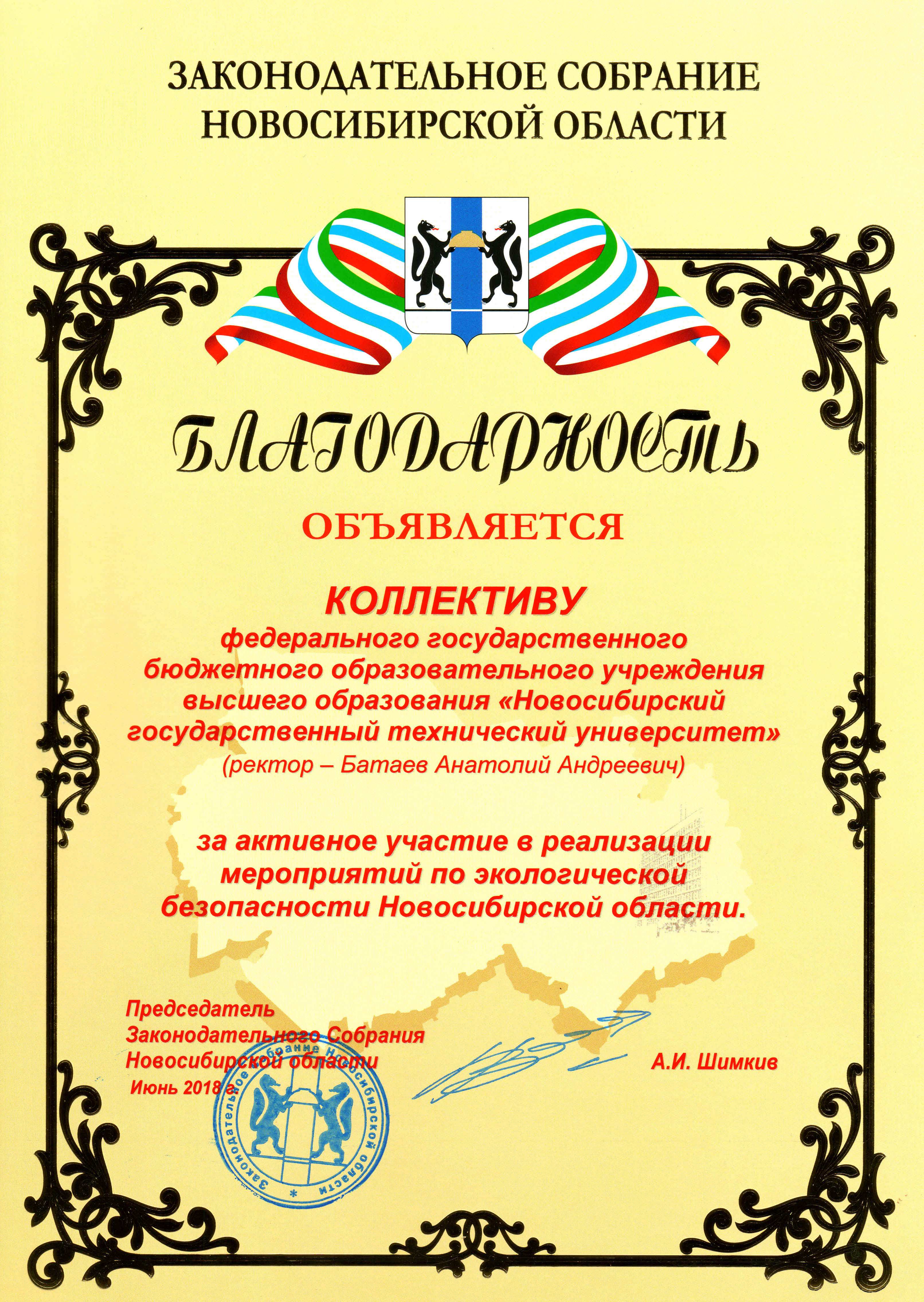За активное участие в реализации мероприятий по экологической безопасности Новосибирской области Законодательное собрание НСО объявило благодарность коллективу НГТУ.