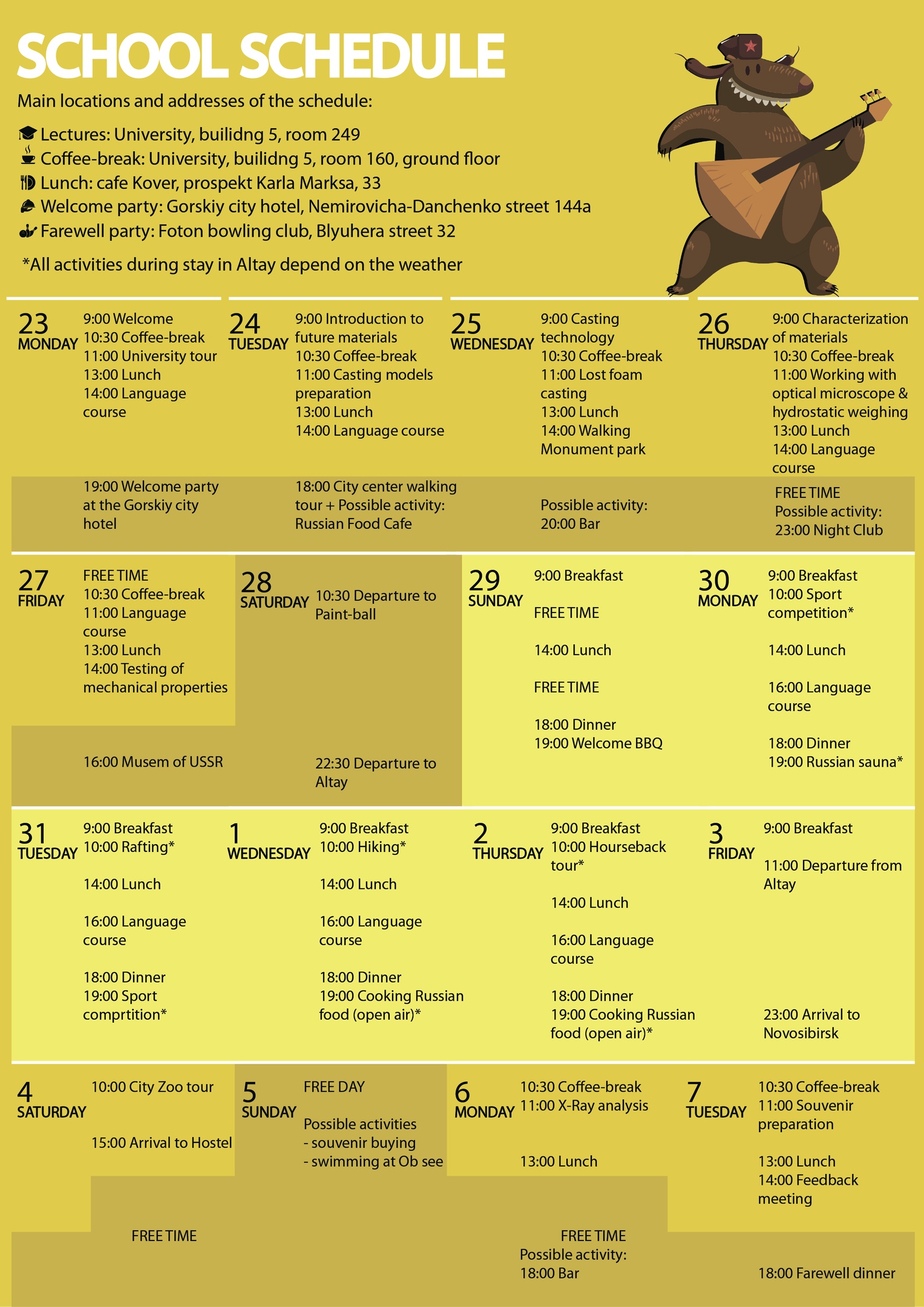 В рамках Летней школы пройдут лекции, посвящёные современным технологиям и материалам, применяемым в различных отраслях промышленности. На практических занятиях участники изучат структурные особенности, физические и механические свойства алюминиевых сплавов с применением таких методов, как оптическая металлография, рентгенофазовый анализ, гидростатическое взвешивание, испытания на статическое растяжение и растровая электронная микроскопия. В программе Школы также запланированы занятия по русскому языку как иностранному, спортивные, культурные мероприятия и поездка на Алтай.