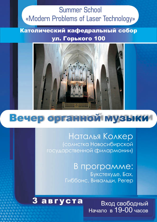 3 августа (воскресенье) в рамках культурной программы летней школы «Современные проблемы лазерных технологий» в католическом кафедральном соборе (ул. Горького 100), состоится концерт органной музыки.