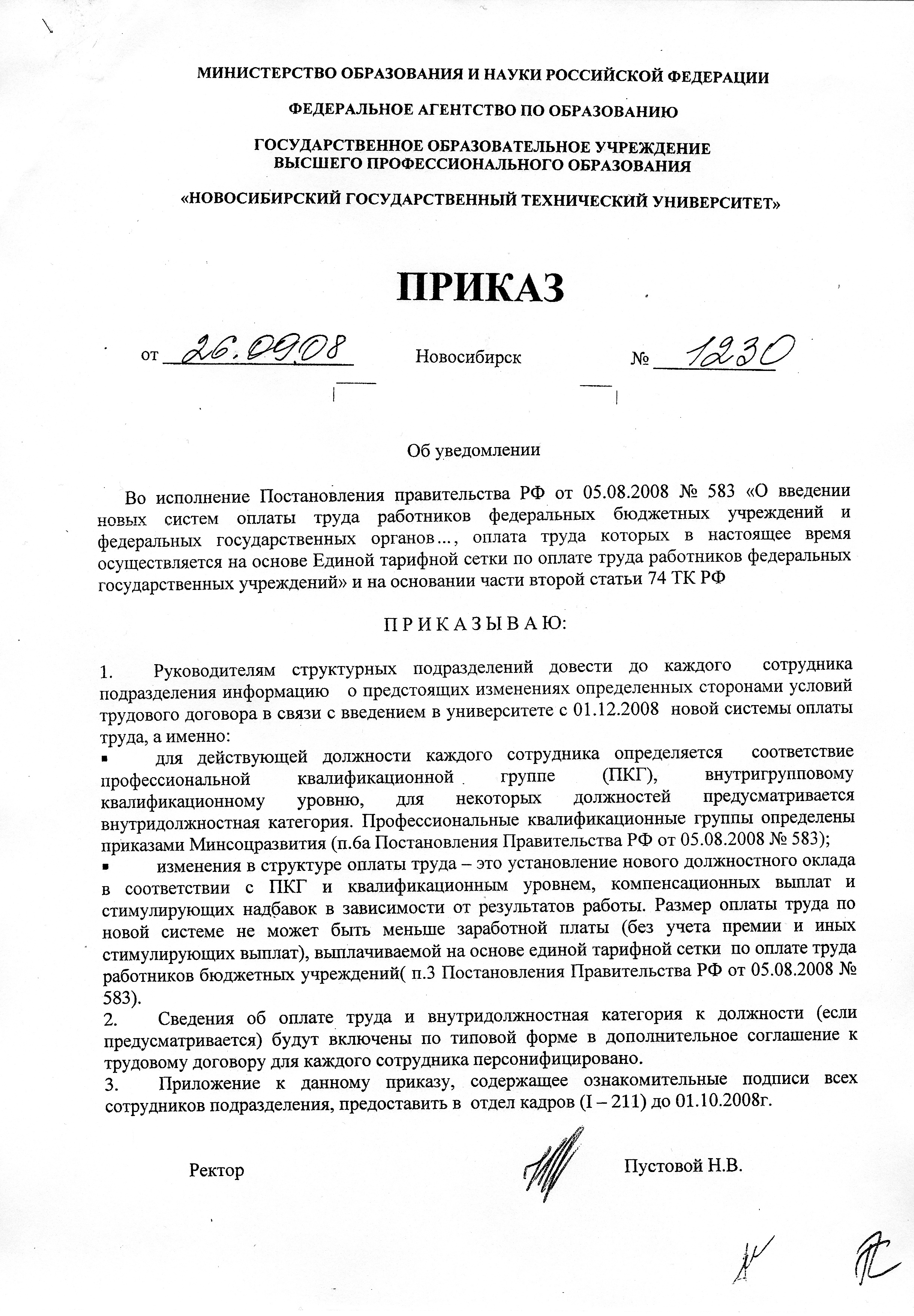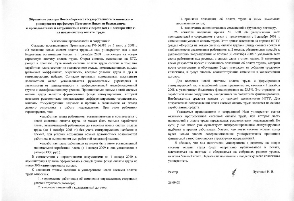 26 сентября ректором НГТУ подписан приказ № 1 230 об уведомлении преподавателей и сотрудников о предстоящих с 1 декабря 2008 г. изменениях системы оплаты труда.
