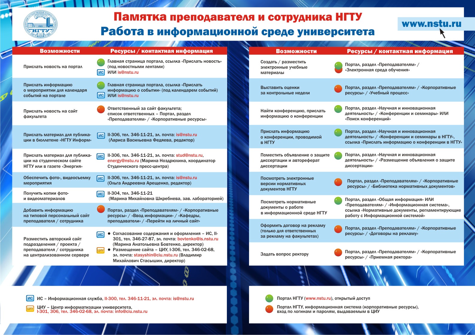 Памятка преподавателя и сотрудника НГТУ «Работа в информационной среде университета» (1 страница А3, JPG) (скачать файл, 496 Кб)